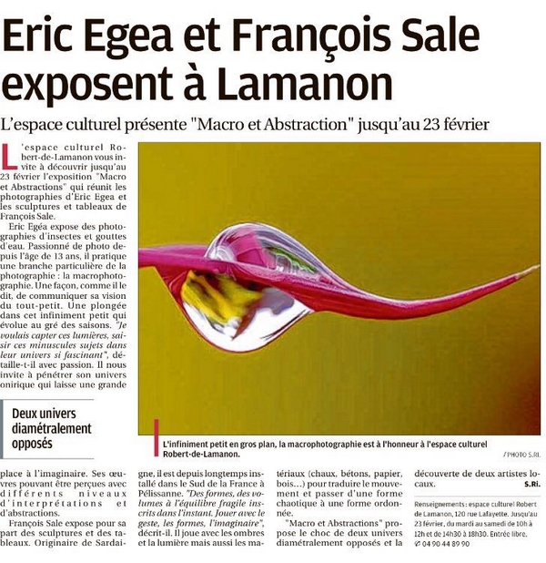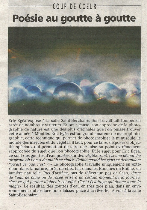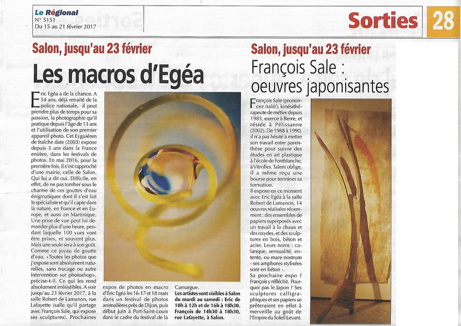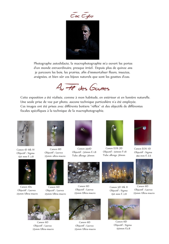 sera visible au domaine de Montauger à Lisses (91) dans la maison départementale de l'environnement - Vernissage le 2 juillet à 18h00 ![]() Les 27, 28 et 29 mai Nouveau Festival Mer'Veilles Nature Sous la Halle de Mer (41) https://www.merveillesnature.com/edition-2022/ ![]() Du 23 avril au 14 mai 2022 Exposition avec le photographe Thierry Vezon à la salle "La Charité Sainte Eutrope" à Gordes (84) ![]() Exposition "Au Fil des Gouttes" Rencontres Photographiques de Chirac (48) 25 au 27 mars 2022 ![]() ![]() Nouvelle expo "Au Fil des Gouttes" au festival international de Montier en Der du 18 au 21 Novembre - Site du chapiteau - Allée 2 ![]() ![]() Du 31 octobre au 31 janvier 2022 Retrouvez mon expo "Couleur Macro" aux Cabanes de Cacharel Au coeur de la Camargue près des Saintes Maries de la Mer 11 Tirages grands formats 120x80cm ![]() Du 8 au 10 octobre 2021, reprise de l'activité des expos "Fantasmagorie" au Festival "Esprit Nature" à Pontailler sur Saône près de Dijon ![]() EXPOSITIONS 2019 Du 30 octobre au 18 novembre "Un beau petit diable" à l'écomusée de Saint Martin de Crau ![]() Du 18 au 20 octobre Festival la Salamandre à Morges - Suisse ![]() Du 4 au 11 octobre "Fantasmagorie" à la galerie "Maison Close" à Arles ![]() Du 26 au 29 septembre Exposition "Un beau petit Diable" au festival Phot'Aubrac à Nasbinals (48) ![]() Du 6 juillet au 30 septembre Exposition à l'Hotel Sofitel Vieux Port à Marseille ![]() ![]() Du 7 au 9 juin, je serai dans la Drôme provençale pour le festival "Un autre regard Ventoux Baronnies" où j'ai l'honneur d'être le parrain de l'édition 2019 ![]() Du 16 au 19 mai vous pourrez voir mon exposition : "Fantasmagorie" en compagnie de nombreux artistes au printemps de la photographie et des arts à Romorantin-Lanthenay (41)