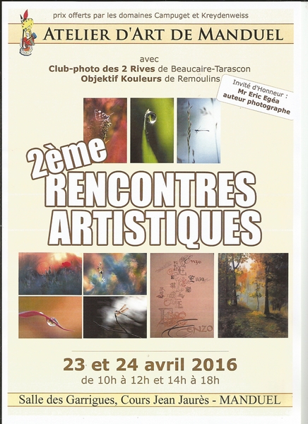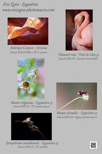 https://www.printempsdelaphoto.fr/ Du 15 au 22 juin mes photos seront exposées à Port de Bouc (13) à l'espace Gagarine dans le cadre des dixièmes rencontres photographiques des clubs photo de l'étang de Berre où j'ai l'honneur d'être invité ![]() HAUT DE PAGE EXPOSITIONS 2018 "Couleur Macro" Les BAUX DE PROVENCE (13)- Galerie de la Citerne - Place de l'Eglise Du 2 au 14 août http://www.lesbauxdeprovence.com/fr/expositions/eric-egea-couleur-macro "Fantasmagorie" Phot'Aubrac, du 20 au 23 septembre à NASBINALS (48) "Couleur Macro" Instants Sauvages, du 23 au 25 novembre à CORNIER (74) ![]() ---- ![]() "Planète Macro" au Château de Lourmarin - 21 mai au 3 juin ![]() ![]() "Fantasmagorie" dans la salle des fêtes de Bourg en Bresse EXPOS 2017 28-29 octobre Palais des Congrès de Gruissan ![]() Festival Phot'Aubrac 2017 ![]() ![]() "Couleur Macro" dans la prison à Saint Urcize Rencontres photo-nature 2017 au Mas de la Samatane (13) jusqu'à la fin octobre ! ![]() HAUT DE PAGE Montbrun-les-Bains du 13 au 16 juillet 2017 dans le cadre du festival "Les silences du Ventoux" ![]() Du 2 au 6 juin à Port Saint Louis du Rhône Festival de la Camargue et du delta du Rhône ![]() Tignécourt dans les Vosges du 08 au 09 avril 2017 "Couleur Macro" ![]() Expo à Saint-Jean-de-Losnes (21) du 17 au 19 mars 2017 ![]() Exposition de trente-sept de mes photos à Salon de Provence du 3 au 23 février 2017 Vernissage le vendredi 3 février à 18h30. Entrée libre ![]() ![]() ![]() ![]() ![]() ![]() ![]() 20 ans du festival International de Montier-en-Der du 17 au 20 novembre 2016 à la salle saint Berchaire avec ma nouvelle expo : Fantasmagorie ![]() ![]() ![]() Rencontres photos nature au Mas de la Samatane - Saint Martin de Crau du 28 septembre au 29 octobre - Vernissage le vendredi 30 septembre 18h00 ![]() Exposition à Cauterets (65) du 16 au 18 septembre 2016 "Couleur Macro" ![]() HAUT DE PAGE Exposition à Sault (84) du 14 au 17 juillet 2016 "Goutte à goutte" ![]() ![]() HAUT DE PAGE ![]() ![]() ![]() Un criquet en couverture du magazine "Chasseur d'Images" de mai 2016 ![]() "Couleur macro" Du 13 au 16 mai 2016 au festival photos et dessins des Pyrénées ![]() Les 23 et 24 avril 2016 aux rencontres artistiques de Manduel - Gard J'y exposerai quelques photos Vernissage le samedi 23 avril à partir de 18h30 ![]() J'aurai le plaisir d'exposer quelques images à Lausanne du 17 mars au 2 avril 2016 dans le cadre d'une exhibition d'art contemporain ![]() Les 5, 6 et 7 février 2016 lors de la 8ème édition de Festimages Nature à Laval. où j'ai eu le plaisir de présenter ma nouvelle exposition "Couleur Macro" ![]() ![]() Du 4 novembre au 29 décembre 2015 au mas de la Samatane ![]() HAUT DE PAGE Du 14 au 18 octobre 2015 au Festival nature de Namur, Belgique ![]() ![]() 6ème édition des rencontres photographiques animalières et de nature. Une fois de plus, nous nous rencontrerons au mas de la Samatane pour échanger autour de notre passion. ![]() Du 14 au 20 septembre 2015 à Chateau-Arnoux, dans les Alpes de Haute Provence, en compagnie de Thierry Vezon et Emmanuel Boitier ![]() ![]() Eric, Thierry et Emmanuel Du 12 au 14 Juin 2015 au Chateau D'Ainay le Vieil dans le Berry ![]() ![]() ![]() Philippe Lebaux, Marc Pihet, Florence Dabenoc et moi même lors du festival Du 15 au 17 mai 2015, festival Nature Hauteville - Lompnes ![]() Du 30 janvier au 1er février 2015 : "Festimages Nature" 7ème édition à Saint-Berthevin près de Laval ![]() Du 20 au 23 novembre 2014 : Exposition "Goutte à Goutte" au festival International de Photo Nature de Montier en Der ![]() ![]() De fin avril à fin septembre 2014 : Expo photos grandes tailles - 6 photographes : Jérôme PRUNIAUX, Vincent FAVRE, Philippe LEBEAUX, Rémi MASSON, Jonathan LHOIR et moi-même La Maison de la Rivière Place du Lavoir (parking visiteurs) 802, Ferme de la Migeonnière (adresse postale) 85600 Saint Georges de Montaigu Tél : 02 51 46 44 67 / Fax : 02 51 48 81 64 ![]() Du 24 septembre au 2 novembre 2014 Vème édition des Rencontres Photographiques Animalières et de Nature. Un rendez-vous important qui favorise les échanges entre le public et les photographes amateurs ou professionnels autour d’une même passion : la photographie. ![]() ![]() 6, 7, 8 et 9 juin 2014 : Festival de photos et dessins nature au Mas d'Azil ![]() HAUT DE PAGE |